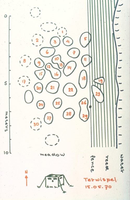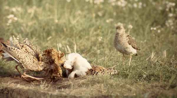 My Ph.D. study already started before I got my M.Sc. degree. It was on a peculiar dimorphism among male ruffs, birds that bear conspicuous ruffs of feathers around their faces. In spring, these males stay together for considerable parts of the day at special sites (leks), most often close to the water (see picture below). Some of the males (resident males) defend very small territories (residences). Others act as guests (satellite males) of the resident males. Females also come to the communal places, but only for short visits. They select a male, mate, and depart again. They nest alone, lay eggs, incubate and tend their chicks, also without any help of the other sex. Resident males sometimes fight and have dark plumages. The satellite males have light plumages (often white ruffs), behave submissively and never fight. Females are considerably smaller than males, are inconspicuous and possess no ruff. A male plays only one of the two roles during his whole life.