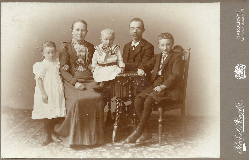 The Heuvel family photographed in Harderwijk in 1905. From right to left: my grandfather Johan Hendrik (1892-1928), his father Hendrik Willem (1864-1926), his brother Hendrik Antonij (1903-1955), his mother Derkje Wesseldijk (1869-1955), and finally his sister Lammerdina Johanna Gerharda (1898-1972).