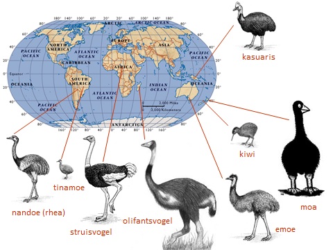 Kennelijk zijn de uitgestorven olifantsvogels en moa's, en de nog bestaande struisvogel, nandoe, emoe, kasuarissen en kiwi's pas later in de evolutie vleugellam en groot geworden.