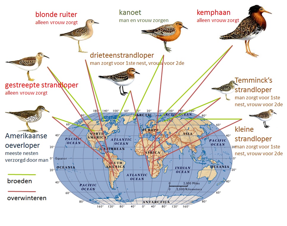 Kemphanen en kokmeeuwen verschillen nogal. Bij de kemphaan, bijvoorbeeld, doet de vrouw al het werk: een nest maken, broeden en jongen begeleiden. Bij de meeuwen doen man en vrouw het meestal samen. Toch staan de twee soorten in de evolutie niet zo heel ver van elkaar. Als je nader gaat kijken in de groep van naaste verwanten van de kemphaan, de groep van de strandlopers, vind je nog steeds grote verschillen. Er zijn monogame soorten, waarvan man en vrouw samen zorgen voor de nakomelingen. Er zijn soorten zonder vaste paarband, zoals bij de kemphaan. Er zijn ook soorten waarbij man en vrouw elk voor een eigen nest zorgen. Bij die soorten is er wel een paarband, maar alleen voor de tijd dat de eieren voor één nest worden gelegd. Als het eerste nest klaar is, zoeken man en vrouw een nieuwe partner. De vrouw blijft op haar tweede nest, de man gaat terug naar het eerste. Ik raakte door dit alles nogal geïnteresseerd in de evolutie van de broedzorg bij vogels.