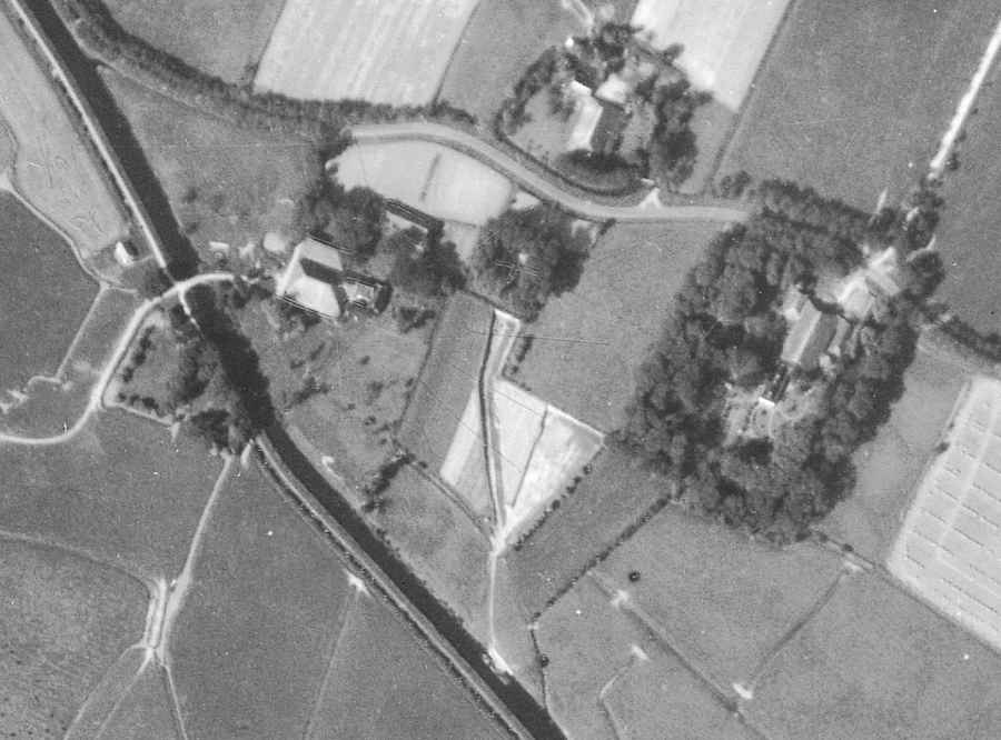 Detail van de luchtfoto uit 1933 met de wierde van Maarhuizen en het Mensingerweerdsterloopdiep. De Enne Jans Heerd ligt links, iets ten noordoosten van het diep.